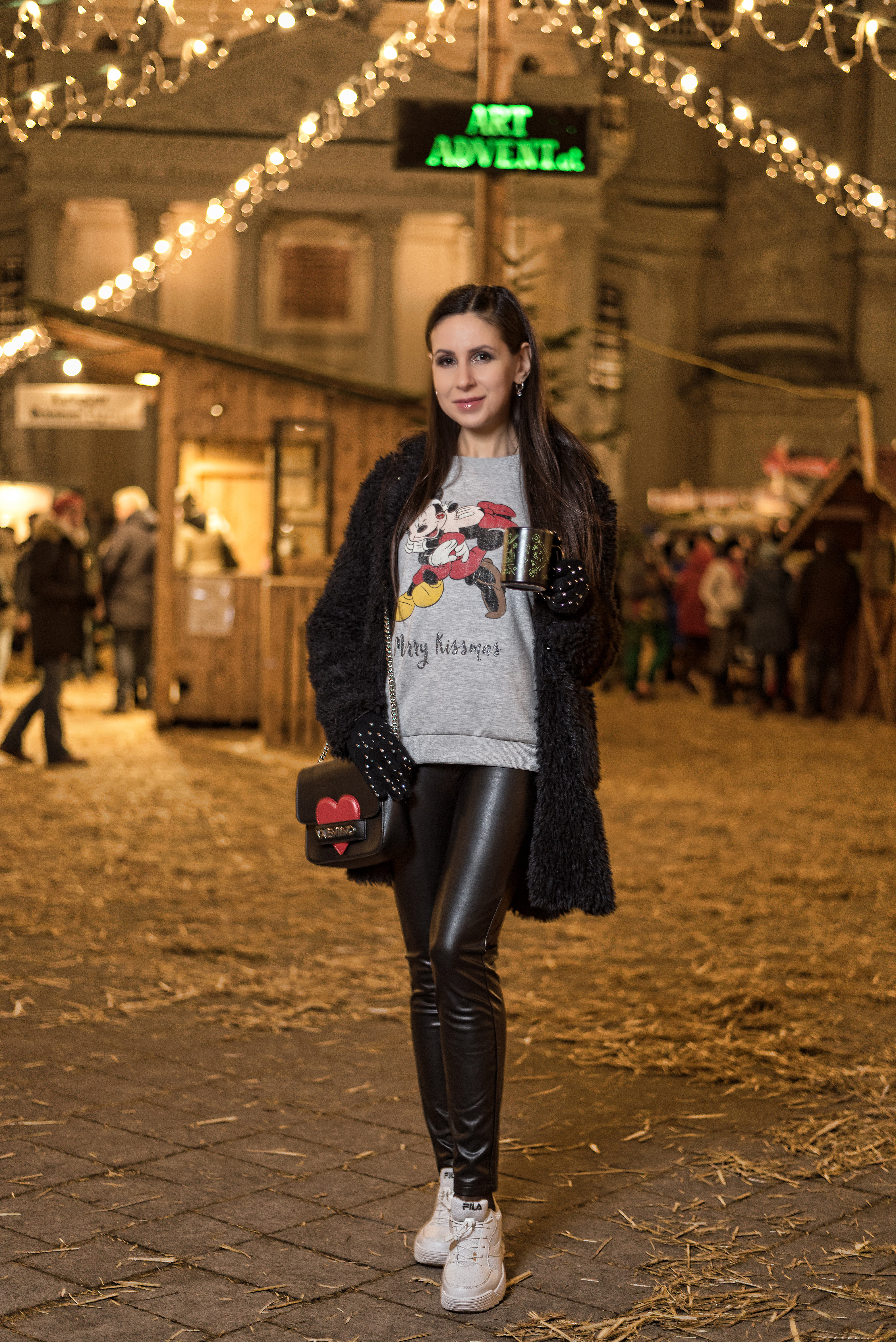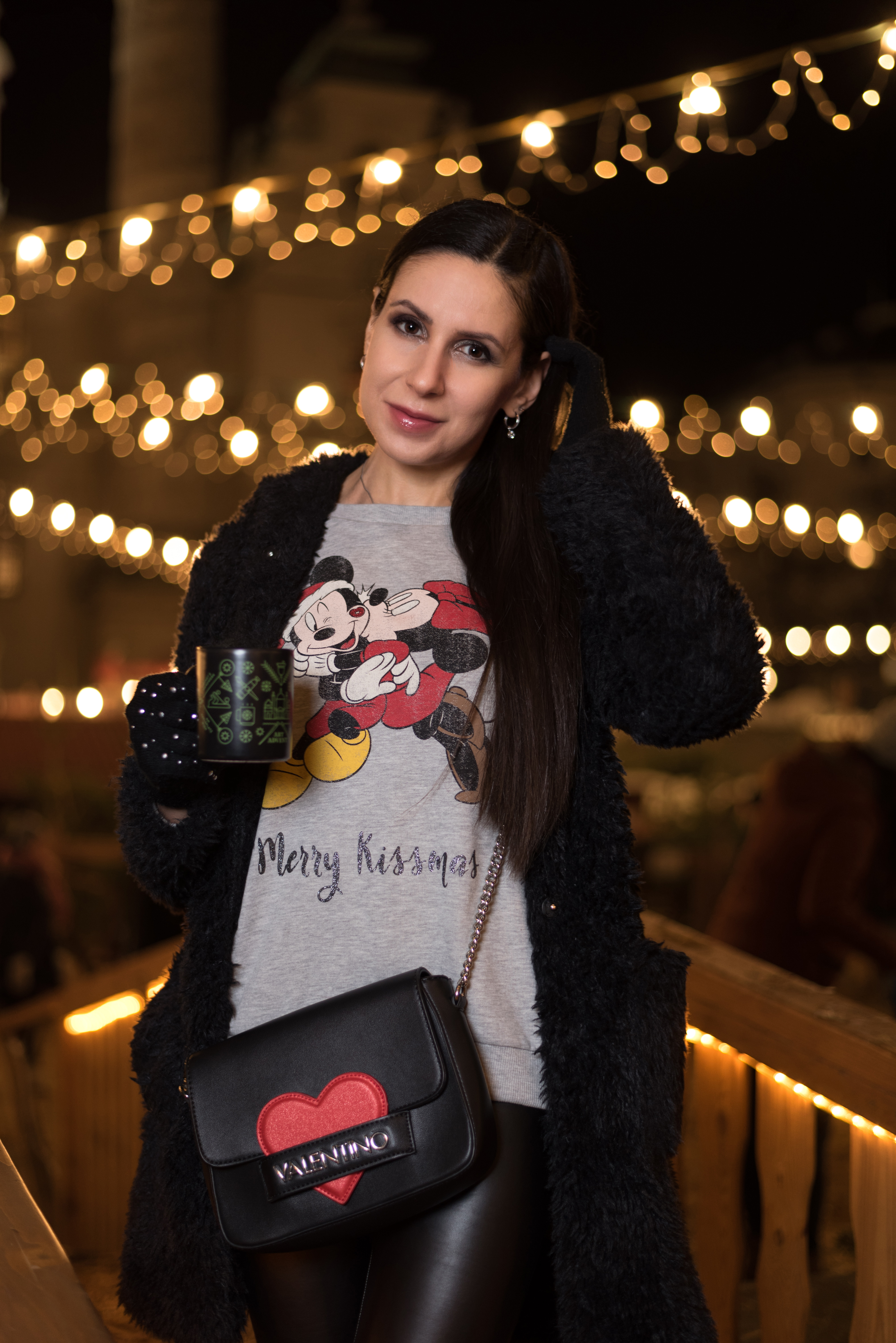 Whether you plan to stay at home or go out during the Christmas days, drink and eat till you drop, lay in bed in your pijamas, or celebrate with the family or friends – one thing’s clear: you need Christmas outfits. And if you’re like me into fashion, then comes the question what to wear. If you don’t know, or don’t have time – keep it simple – a red sweater and a pair of plaid pants is traditional and at the same time trendy. I like almost every kind of plaid pants and for this outfit I chose these Zara black & white leggings pants. And the red sweater is with my favorite Minnie&Mickey Mouse – they keep the child in me alive.