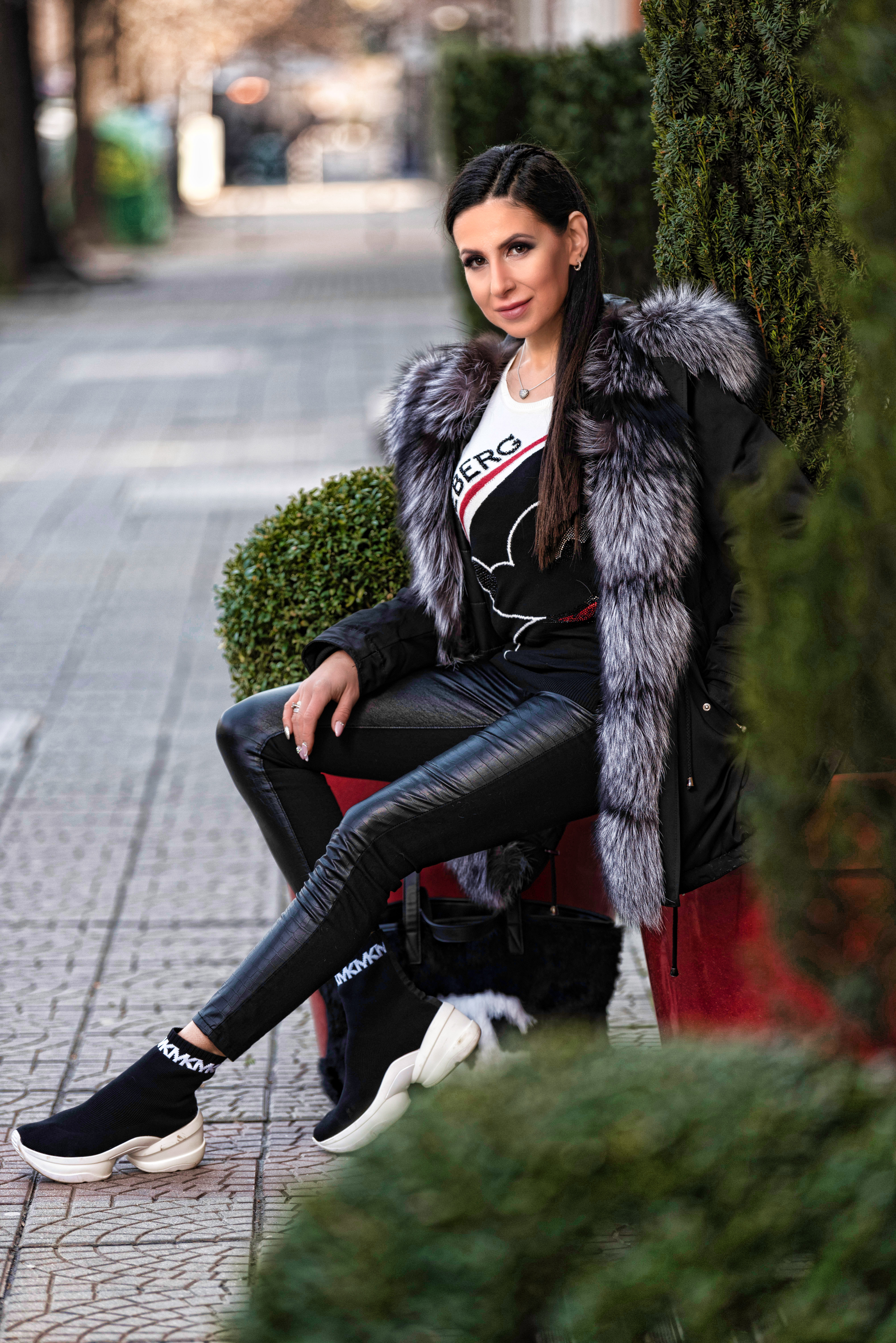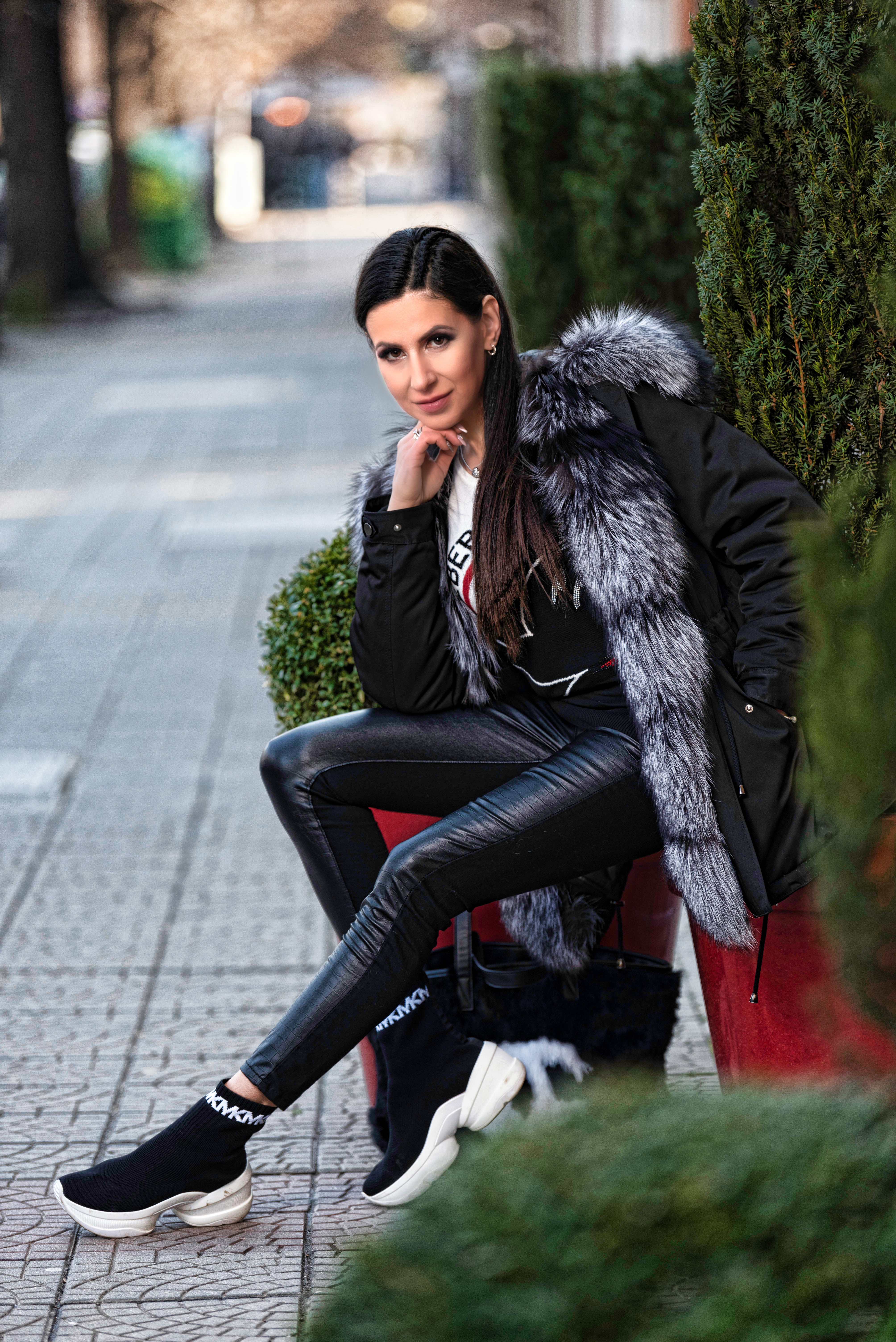 I matched this sweet top with a pair of black Calzedonia faux fur Leggings, Michael Kors Olympia textile sock booties, a black Parka coat and a fluffy, soft, black and white Chanel bag. Meanwhile when I put on those booties for the first time, I had a feeling they are huge and way too sporty (due to the big sole) – but in reality they are extremely light and unbelievably comfortable. I am wearing them most the time now (you are likely to see them in my further outfits).