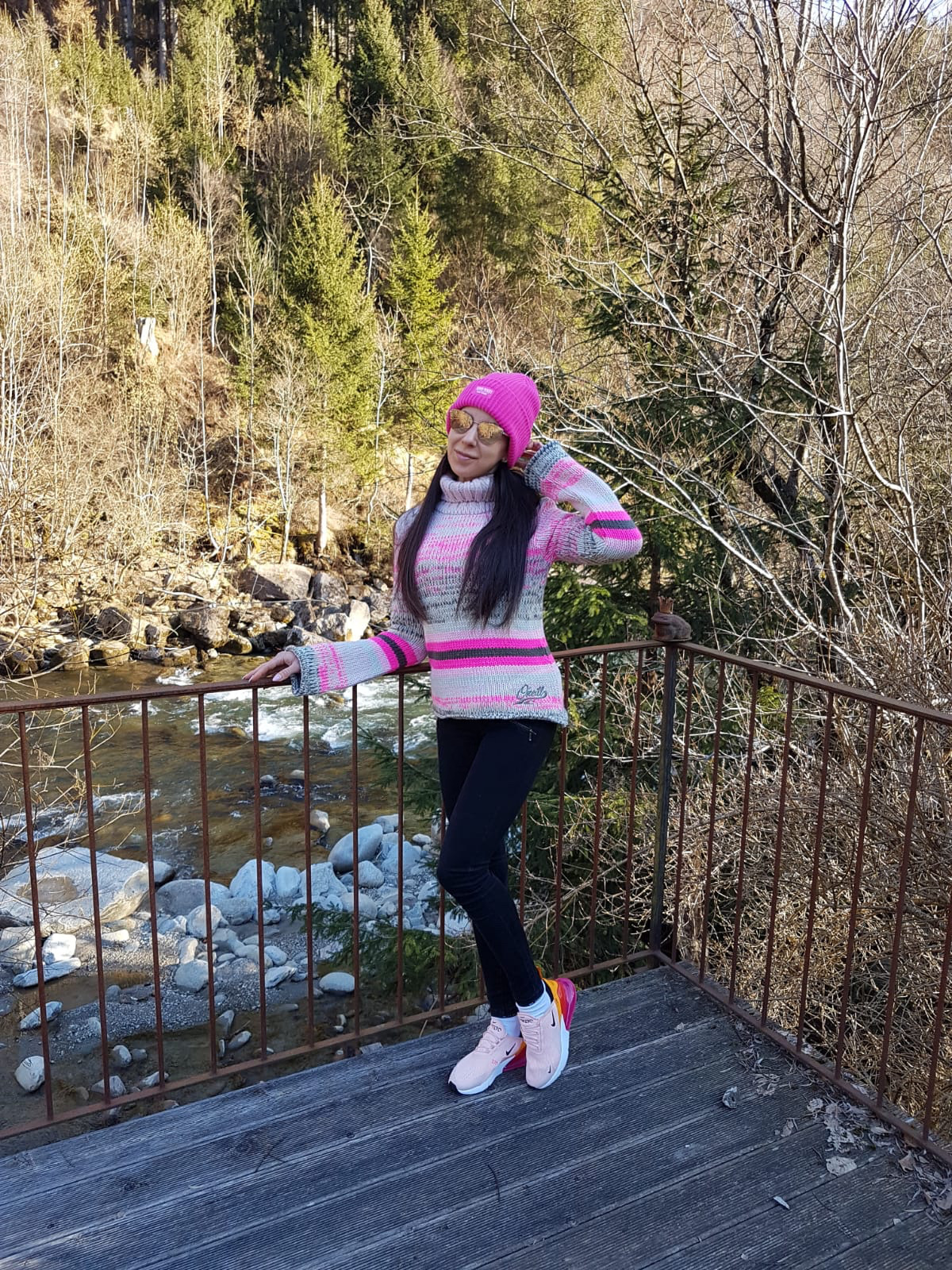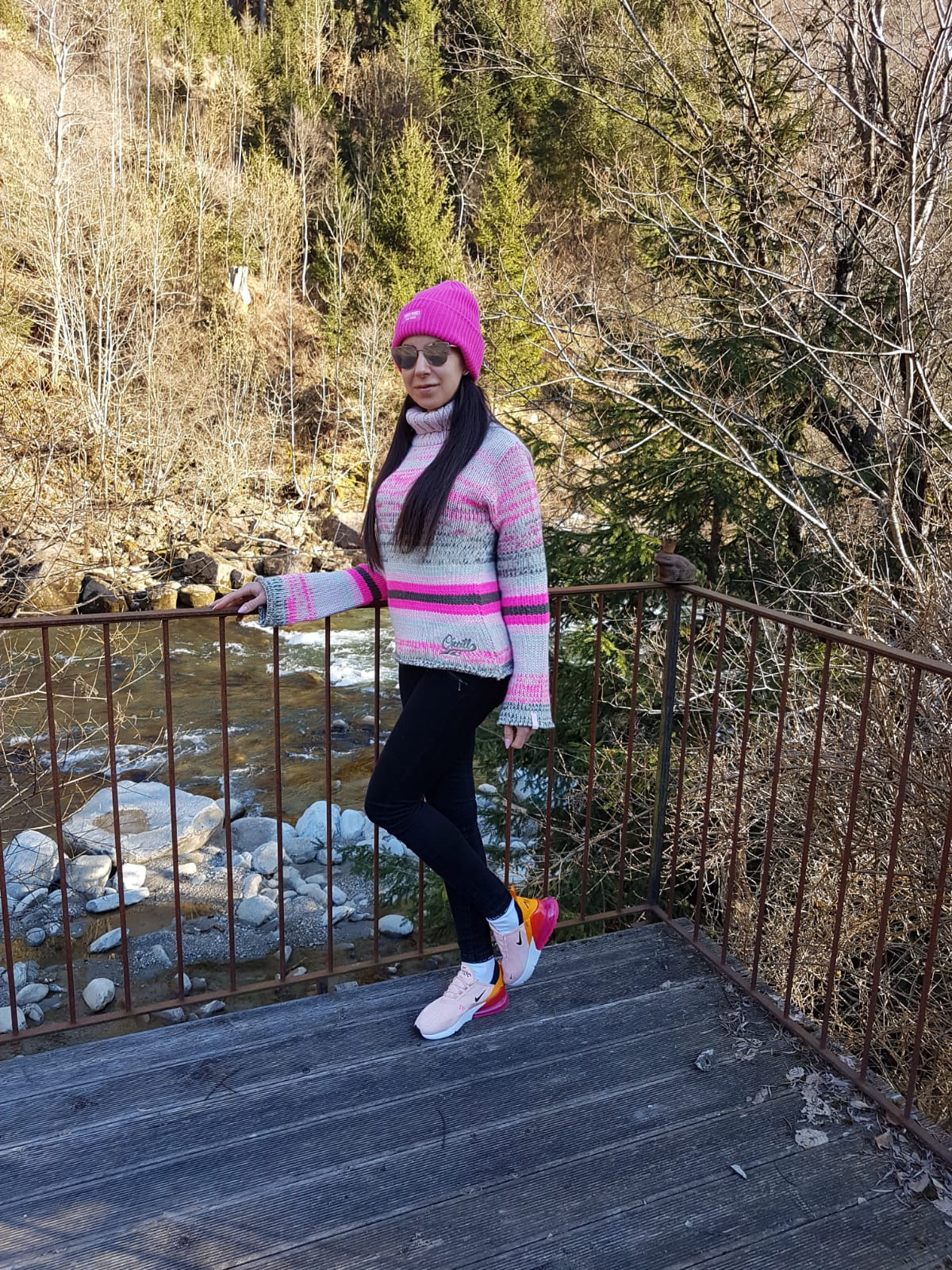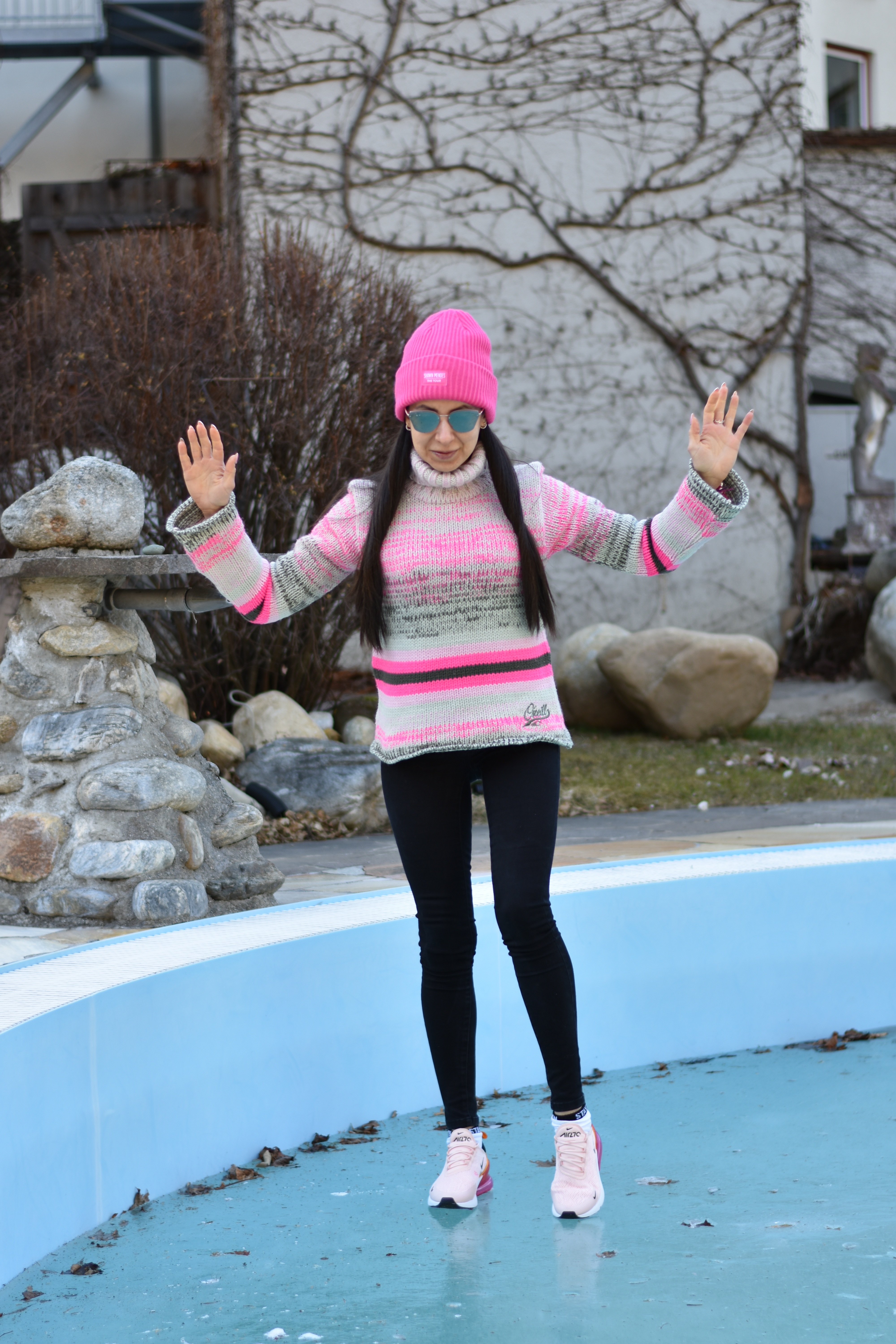 So, seeing the rustling river and this I iced frozen pool I tried imagining that it’s already summer, even being dressed in this thick sweater. I meanwhile love this roughly weaved O‘Neil sweater, with the the Shawn Mendes trendy pink cap and my new Nike Air max 270 sneakers, of course all of them matched in a fashion way.