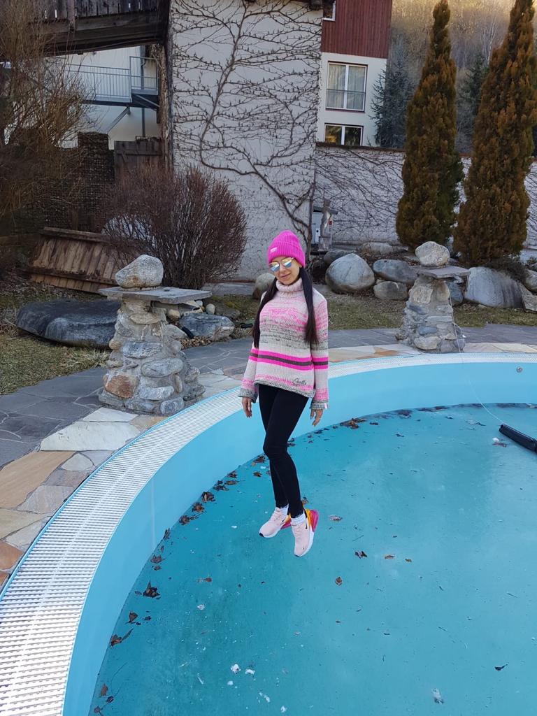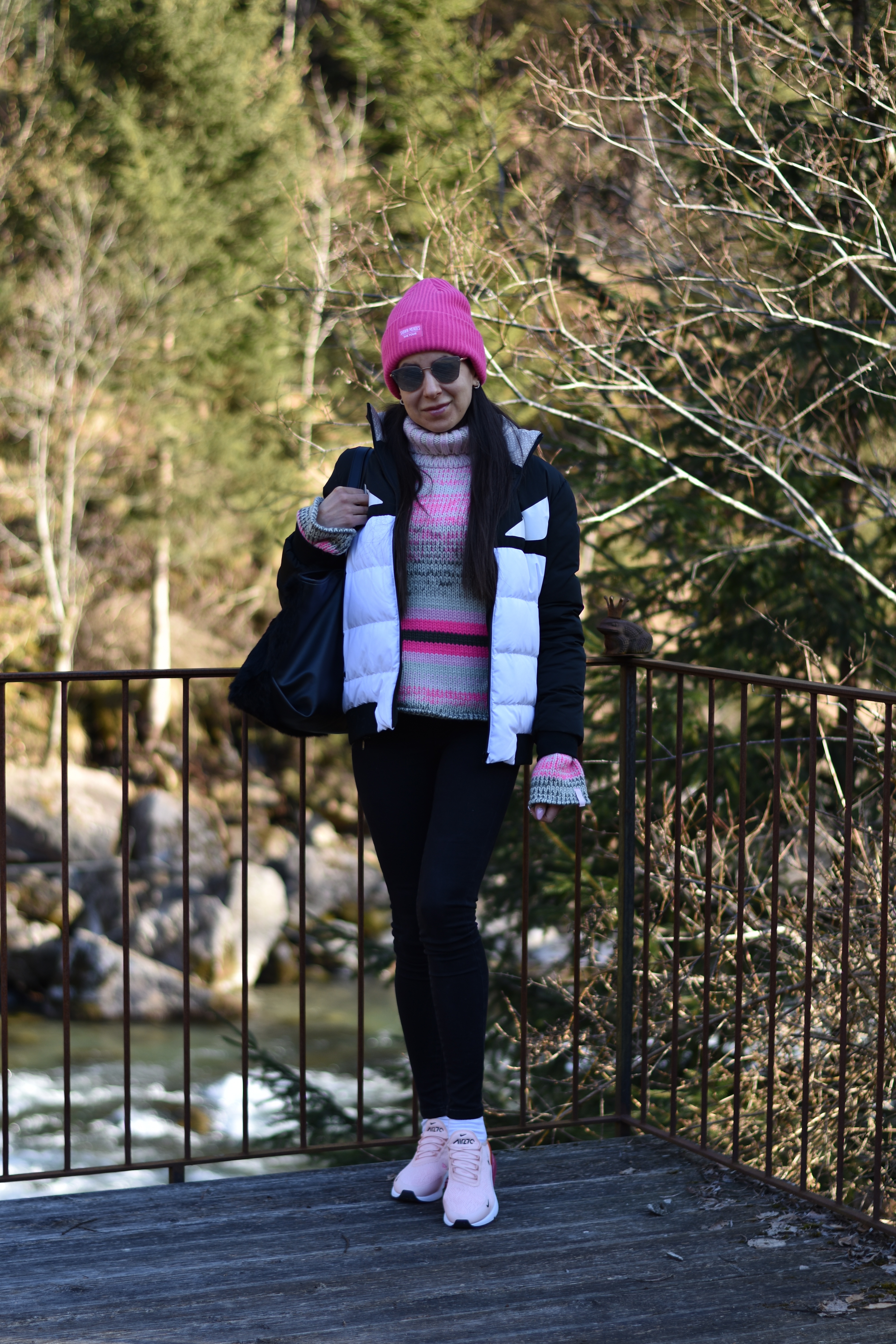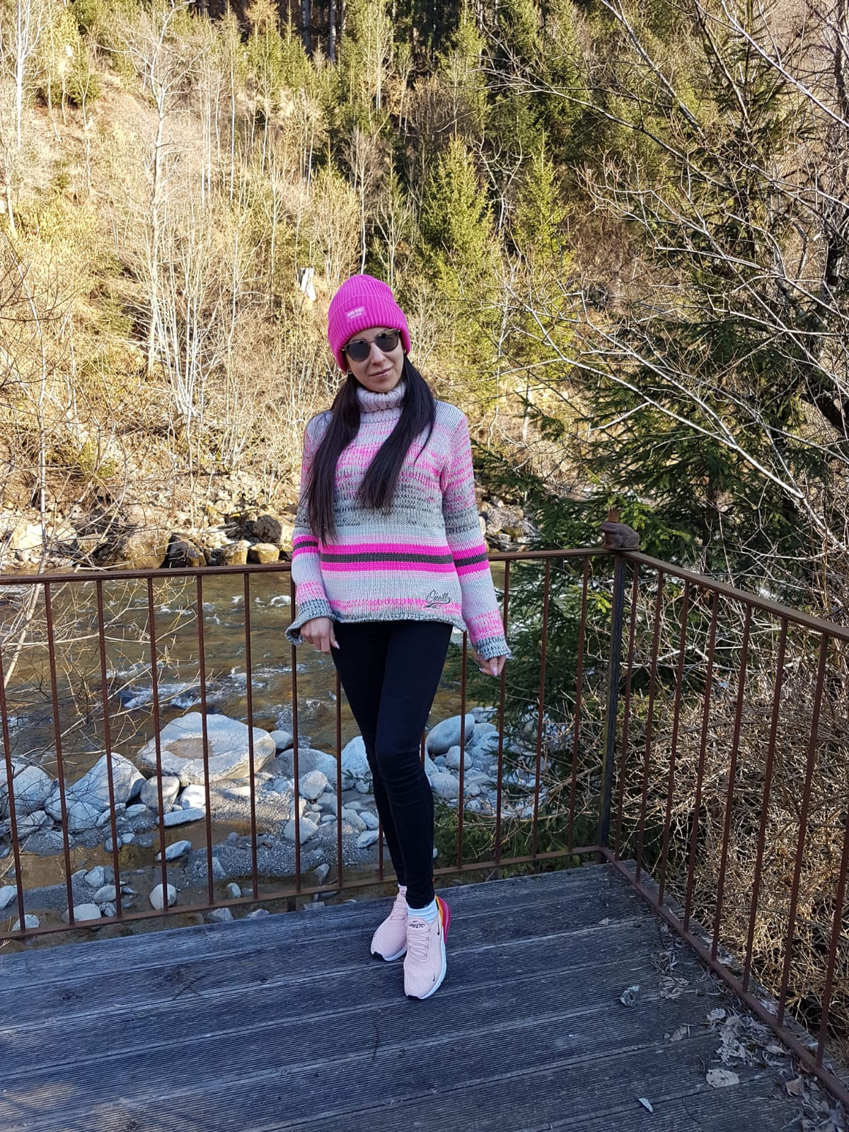 So, seeing the rustling river and this I iced frozen pool I tried imagining that it’s already summer, even being dressed in this thick sweater. I meanwhile love this roughly weaved O‘Neil sweater, with the the Shawn Mendes trendy pink cap and my new Nike Air max 270 sneakers, of course all of them matched in a fashion way.
