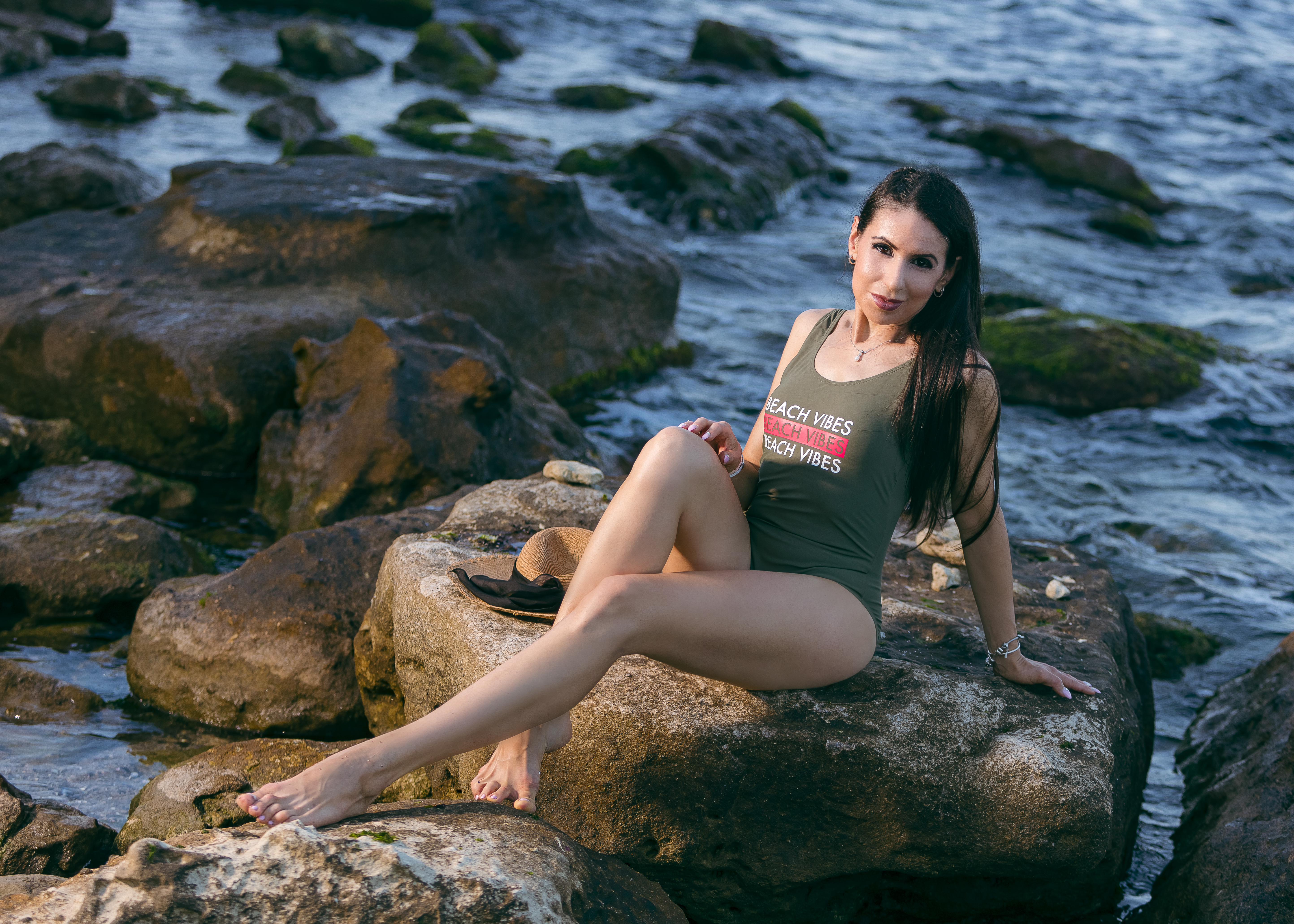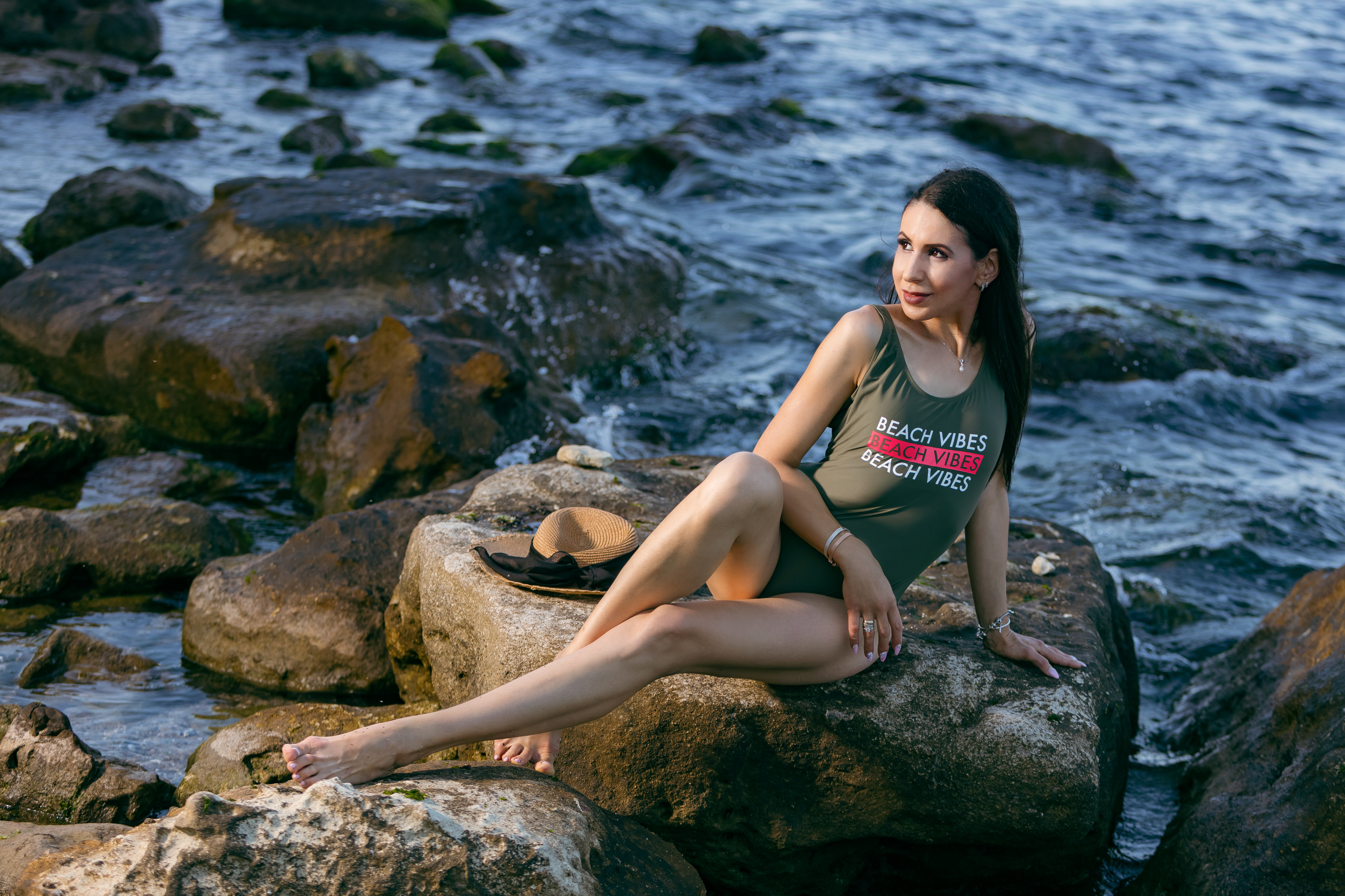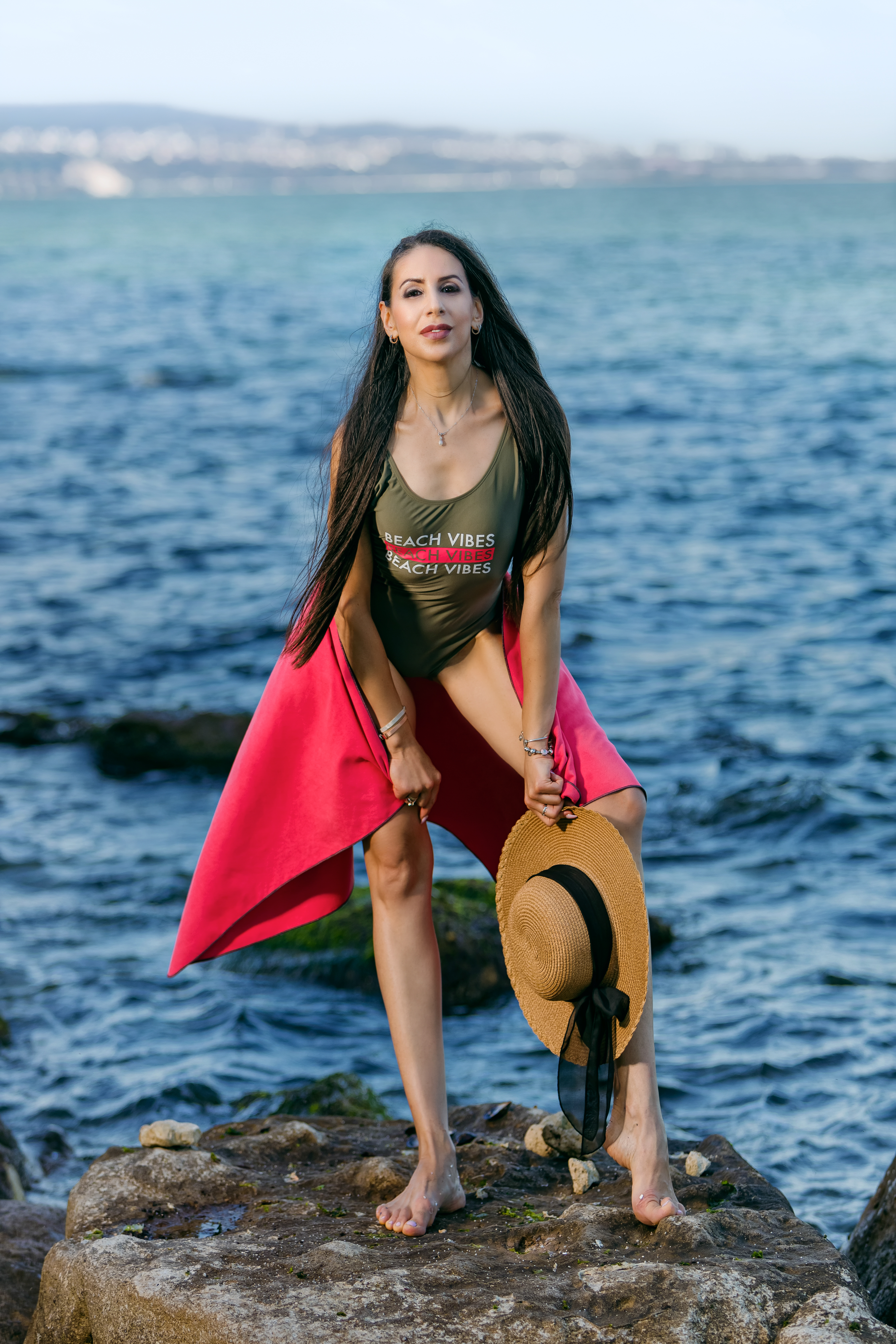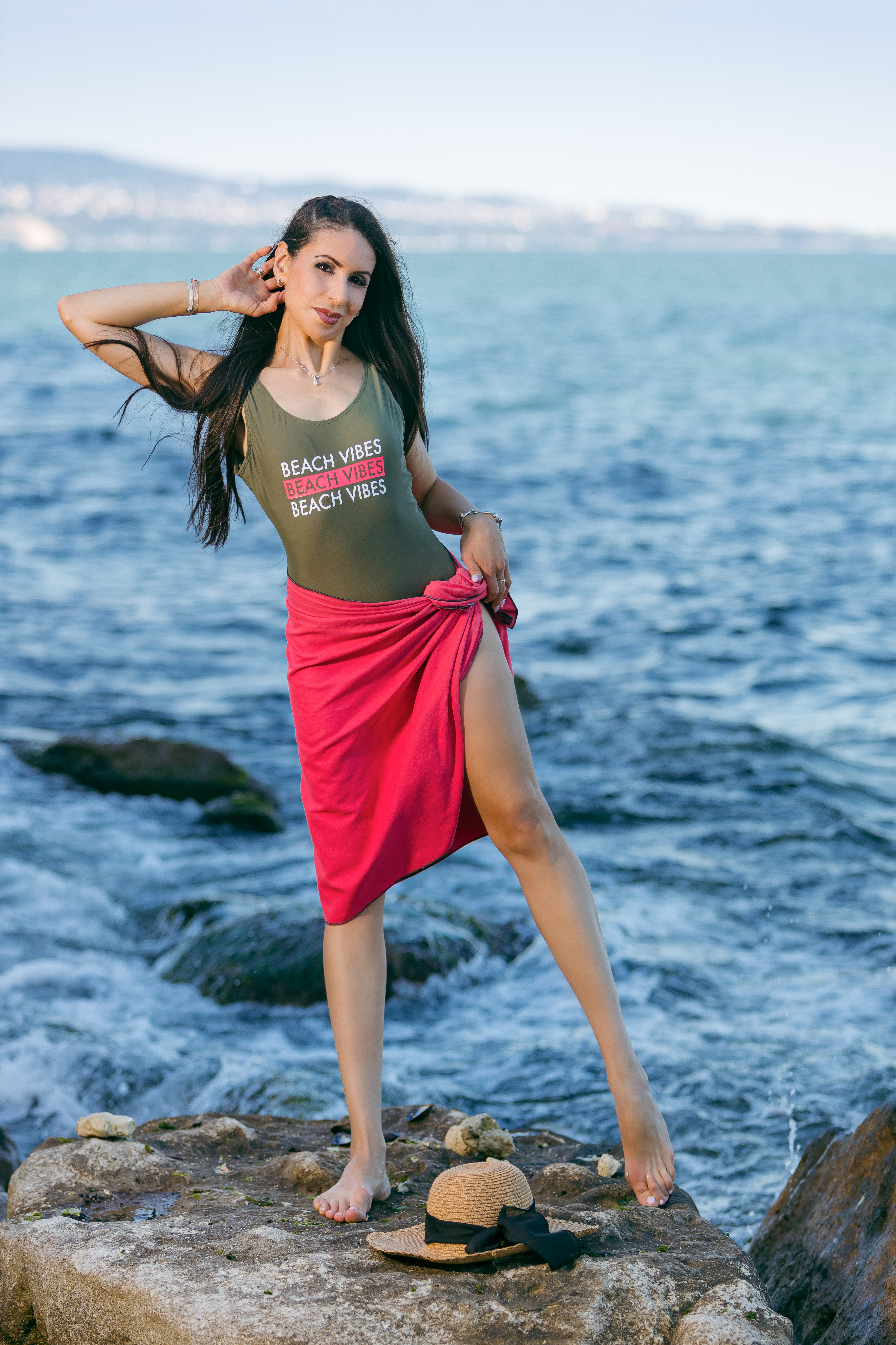 Beach vibes, sea, sun and sea coast, what else – a nice swimming suit of course. I was always in love some of the earth colors – green, olive green, beige… Normally the brighter eye catching colors are more desired, but I want to show you that the neutral colors combined with some accessories can also be a good match. Here I am wearing an army green swimming suit, a salmon red scarf and nice straw hat. In addition the army green color is one of the fall’s emerging color trends. There is a noticeable shift this year’s fall towards traditionally warmer tones like clay and this army green.