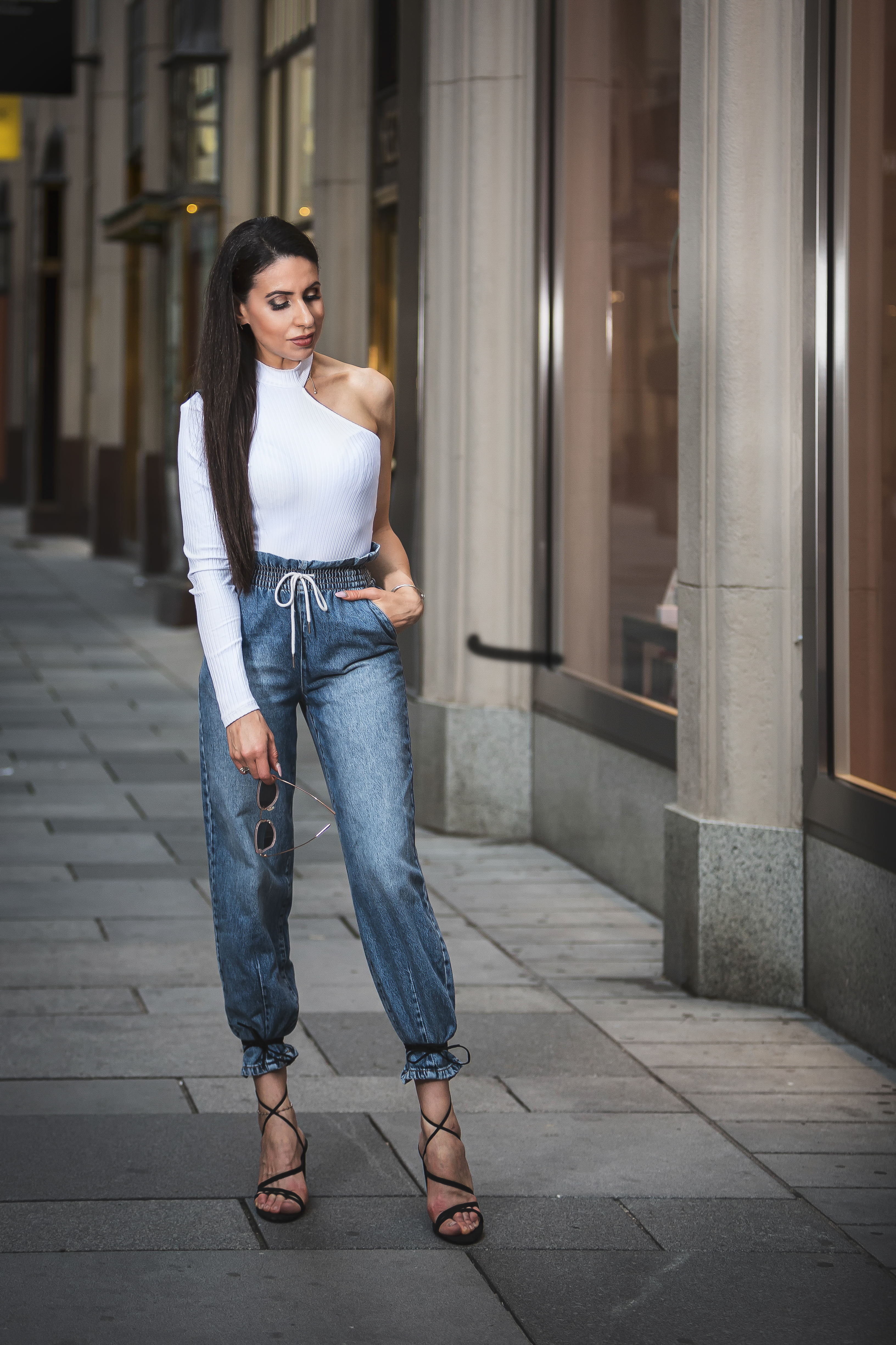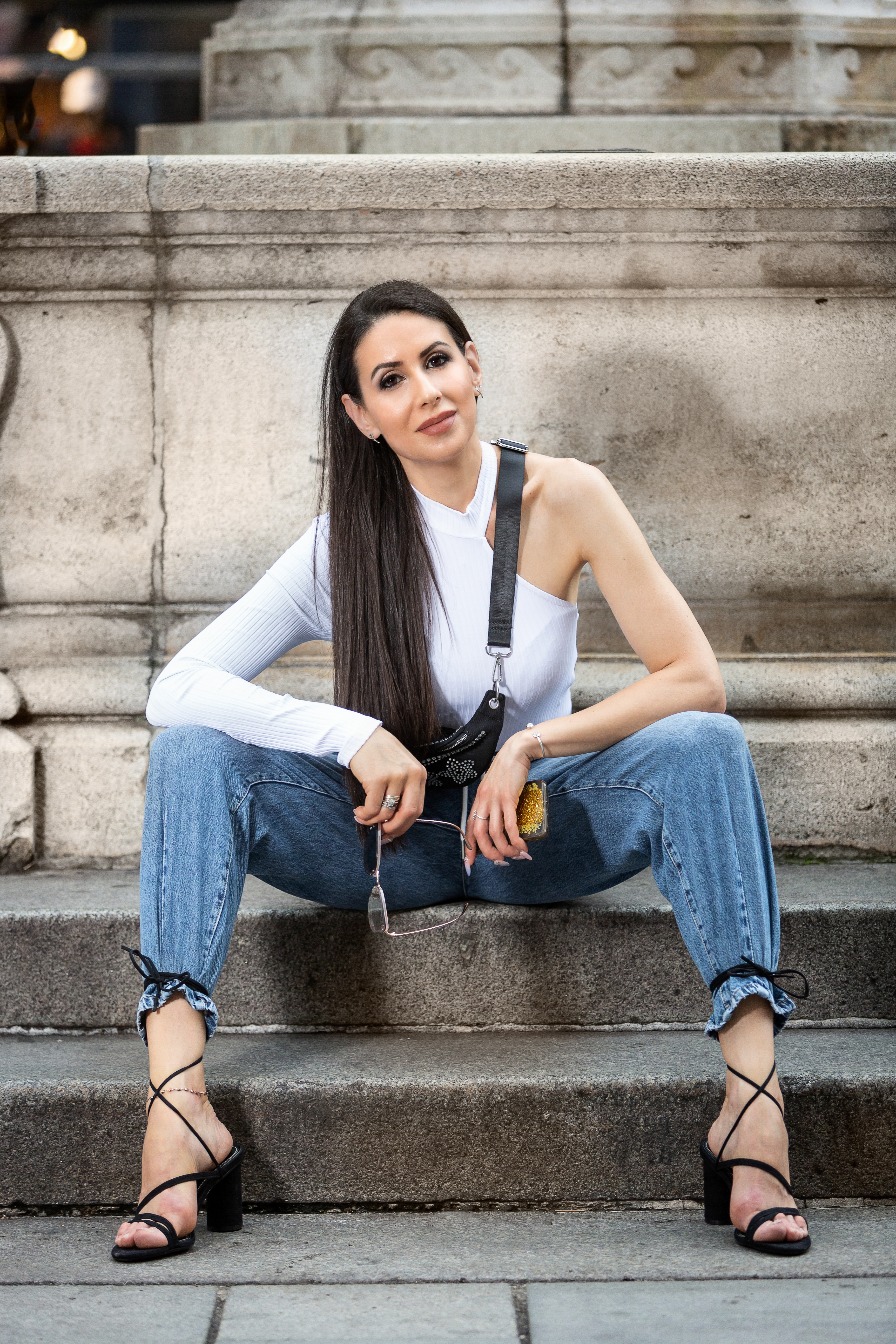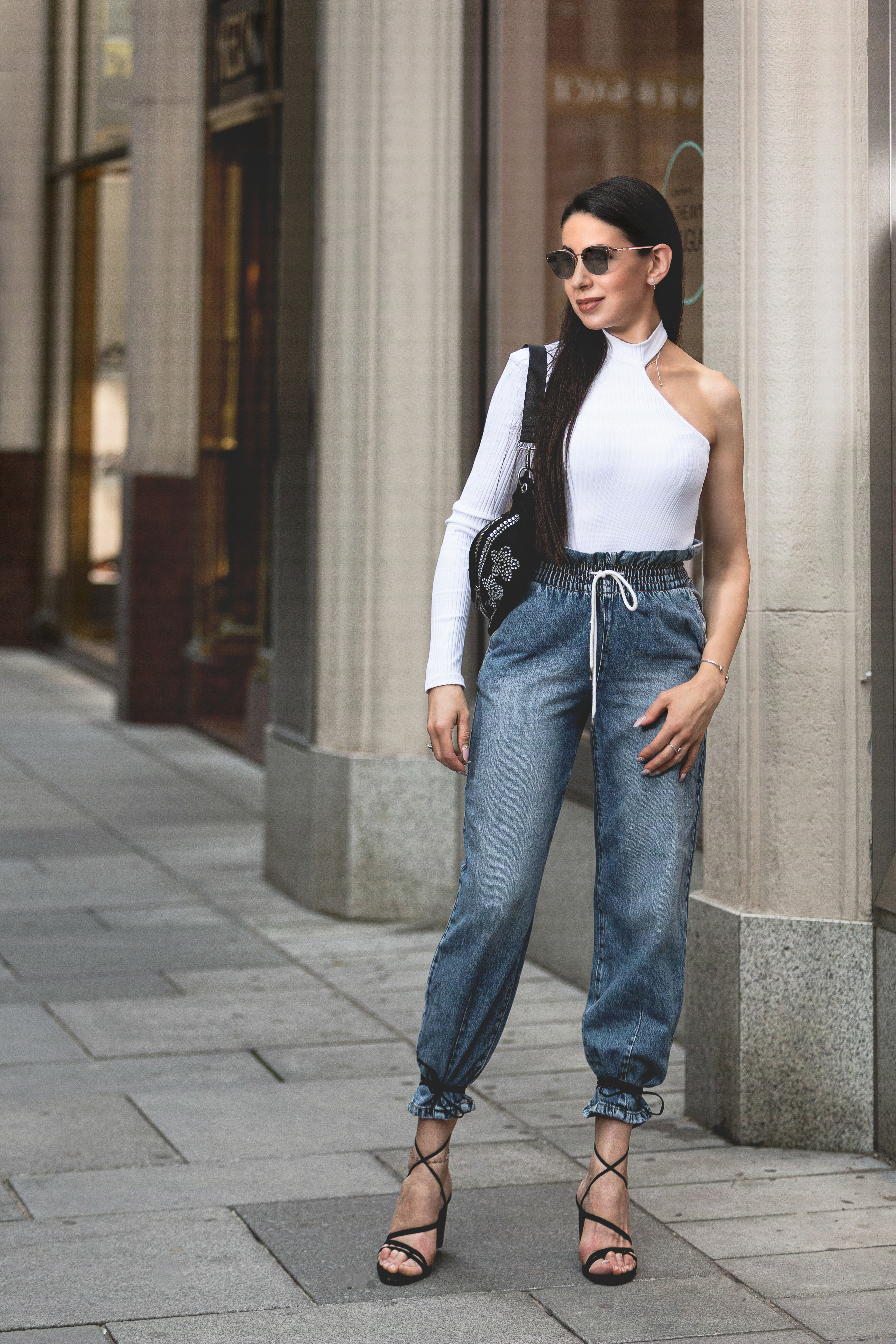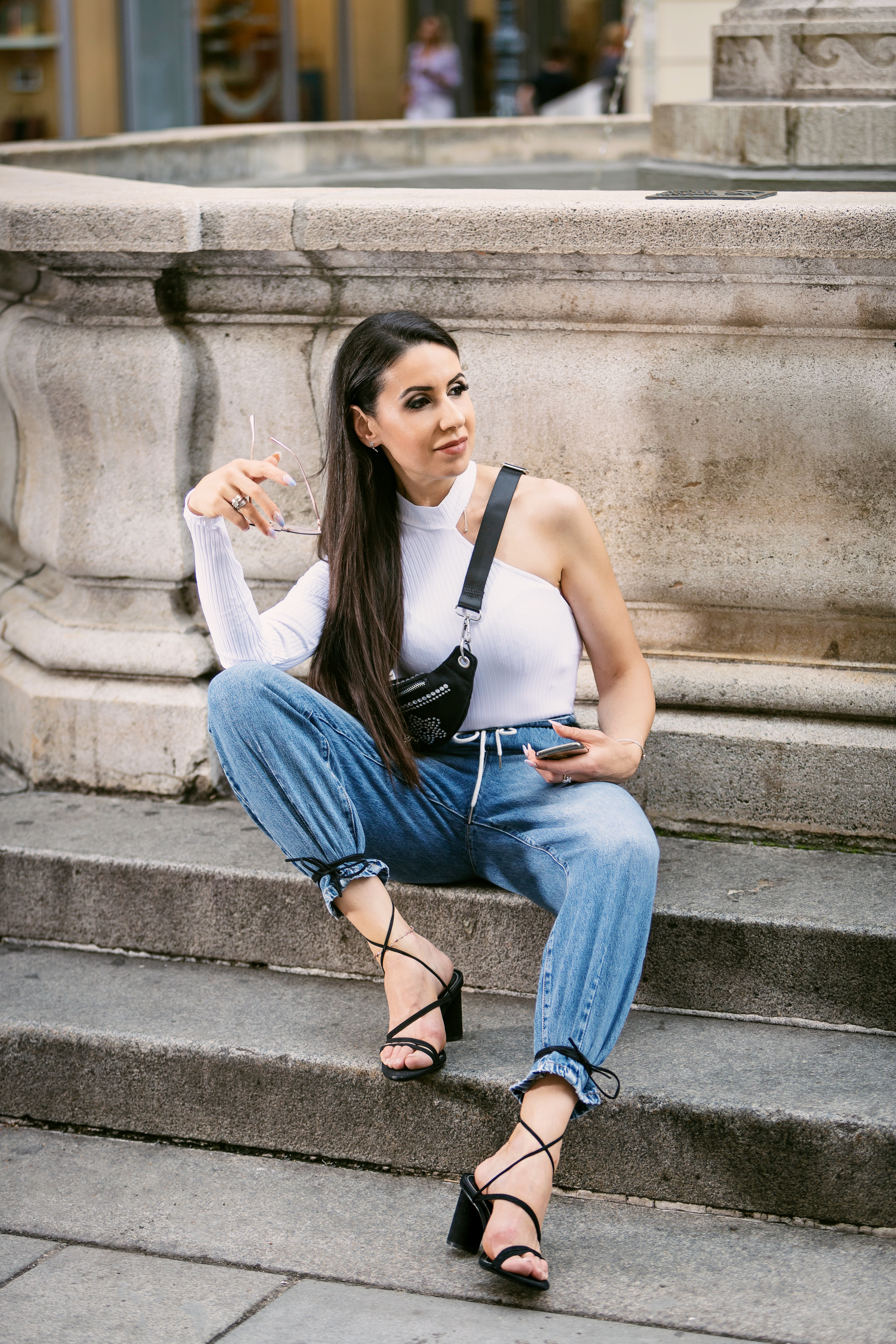 With this shirt you get the feeling that it is still summer (I like that very much because don’t want it to go), but at the same time you have a long sleeve on, well suited for the present times. What can be better? I like it also because it’s eye-catching and it’s matchable with lots of things – jeans, skirts, etc. I matched it with cool balloon jeans, open shoes tied trendily to the jeans and a really comfortable belly bag. Belly bags are not only trendy but also very practical. Hope you like this outfit, matched in a fashionway.