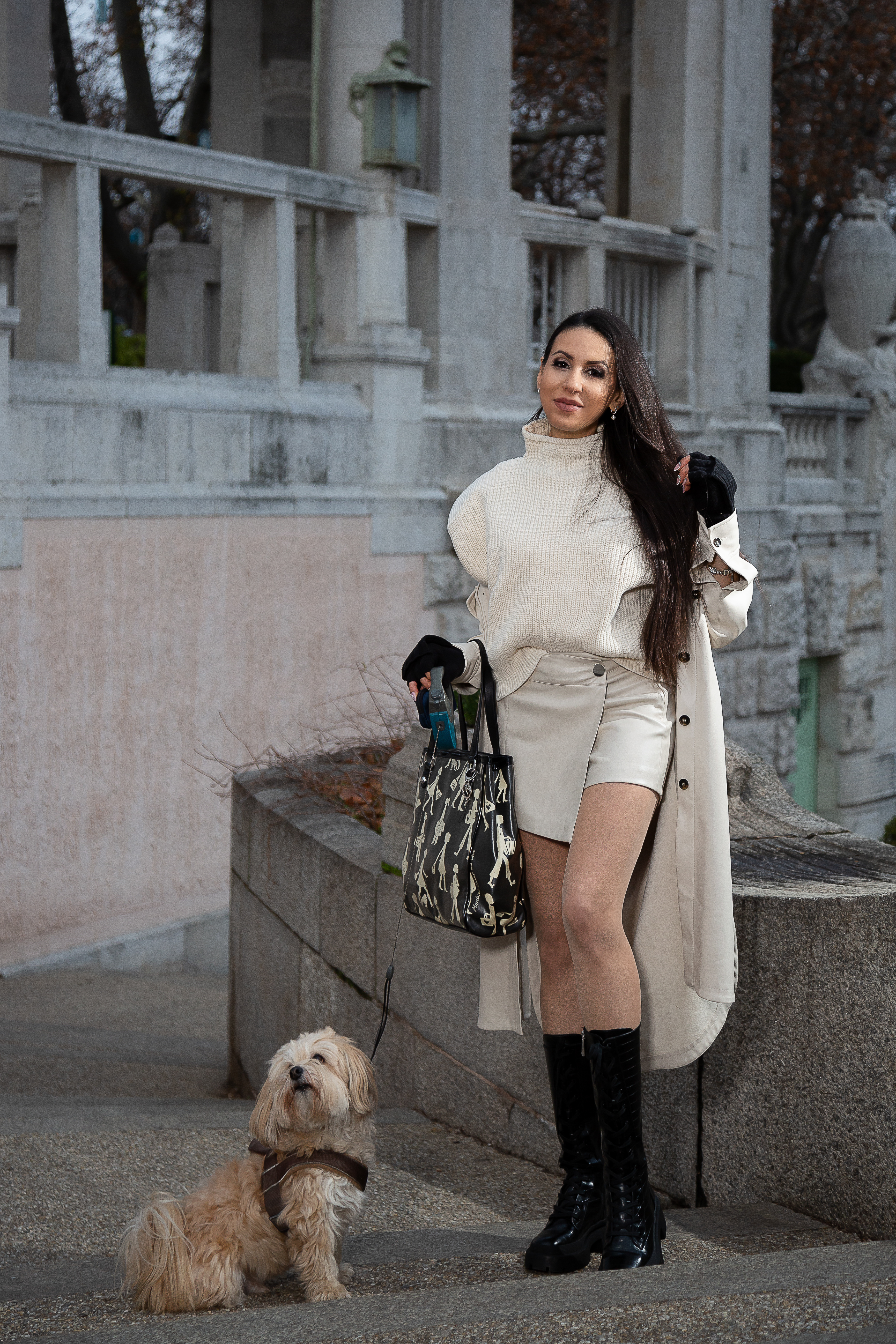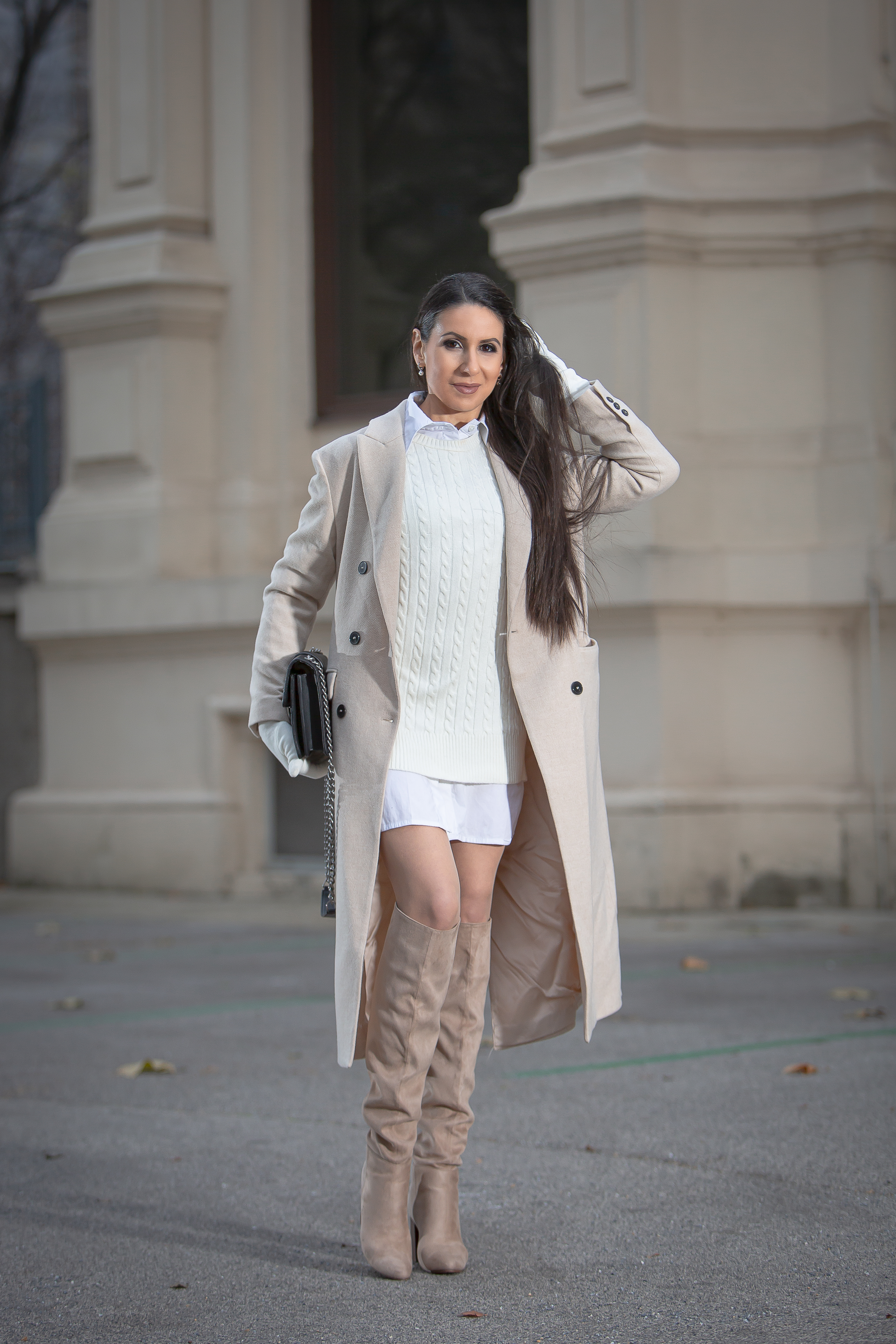 One of my favorite pieces of clothing at the moment is this colorful stretchy dress from Chiara Ferragni. It is not only very comfortable, but can actually be combined with everything, whether with leggings or pants. Here I combined it with over-the-knee leather Zara boots. Since it’s still a bit cold in the evenings at the moment, I can’t do without a coat just yet. I also really like wearing this pink bear coat by PULL & BEAR. I topped the outfit with a pink Zara beret and a cute, matching Kenzo bag in a fashionway.