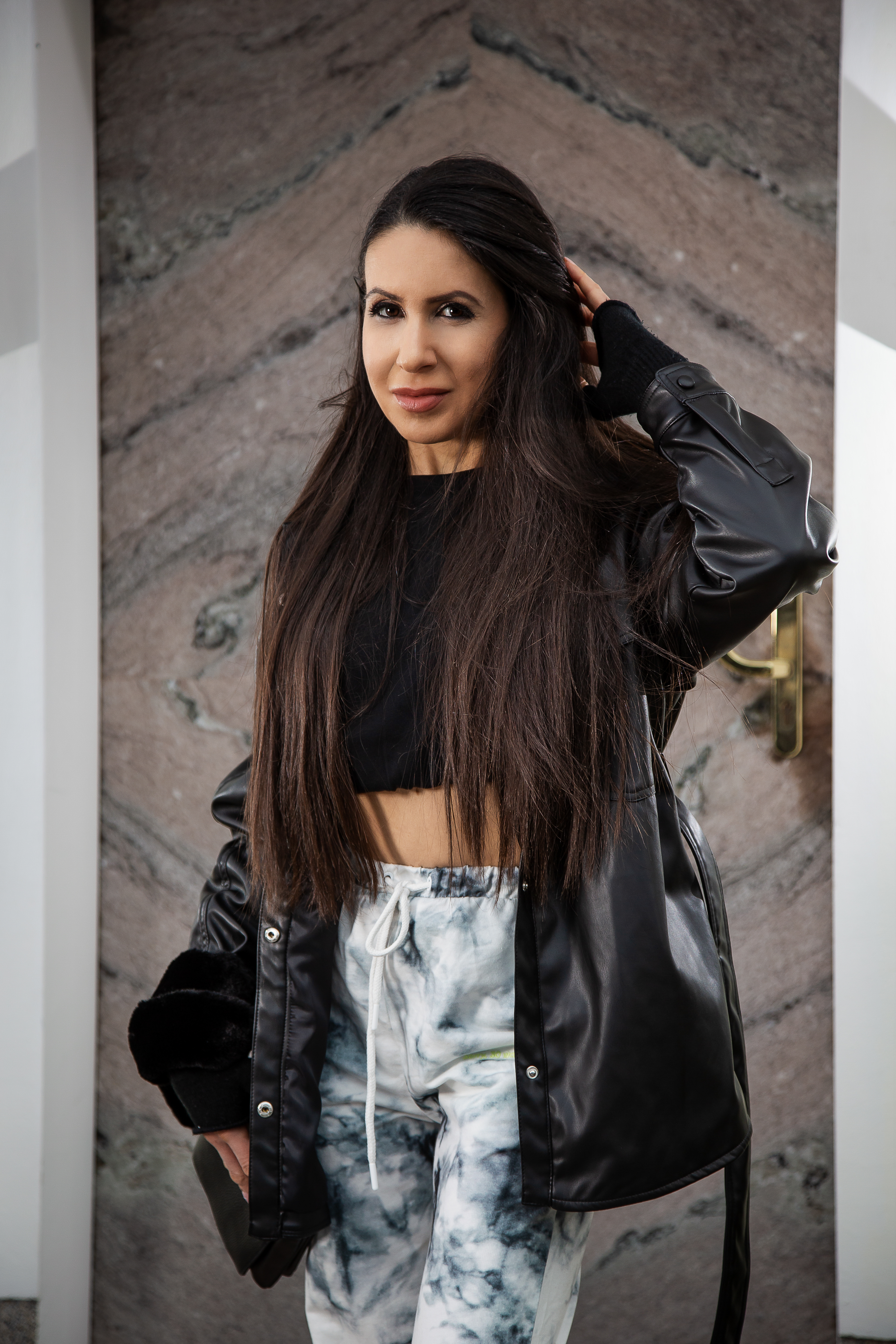 I am showing you today a comfortable, practical and stylish feel-good outfit. I wear the black boots with trendy Bershka jogging pants and a short Zara black top. In addition a black faux leather Jacket and a small black MONKI bag.