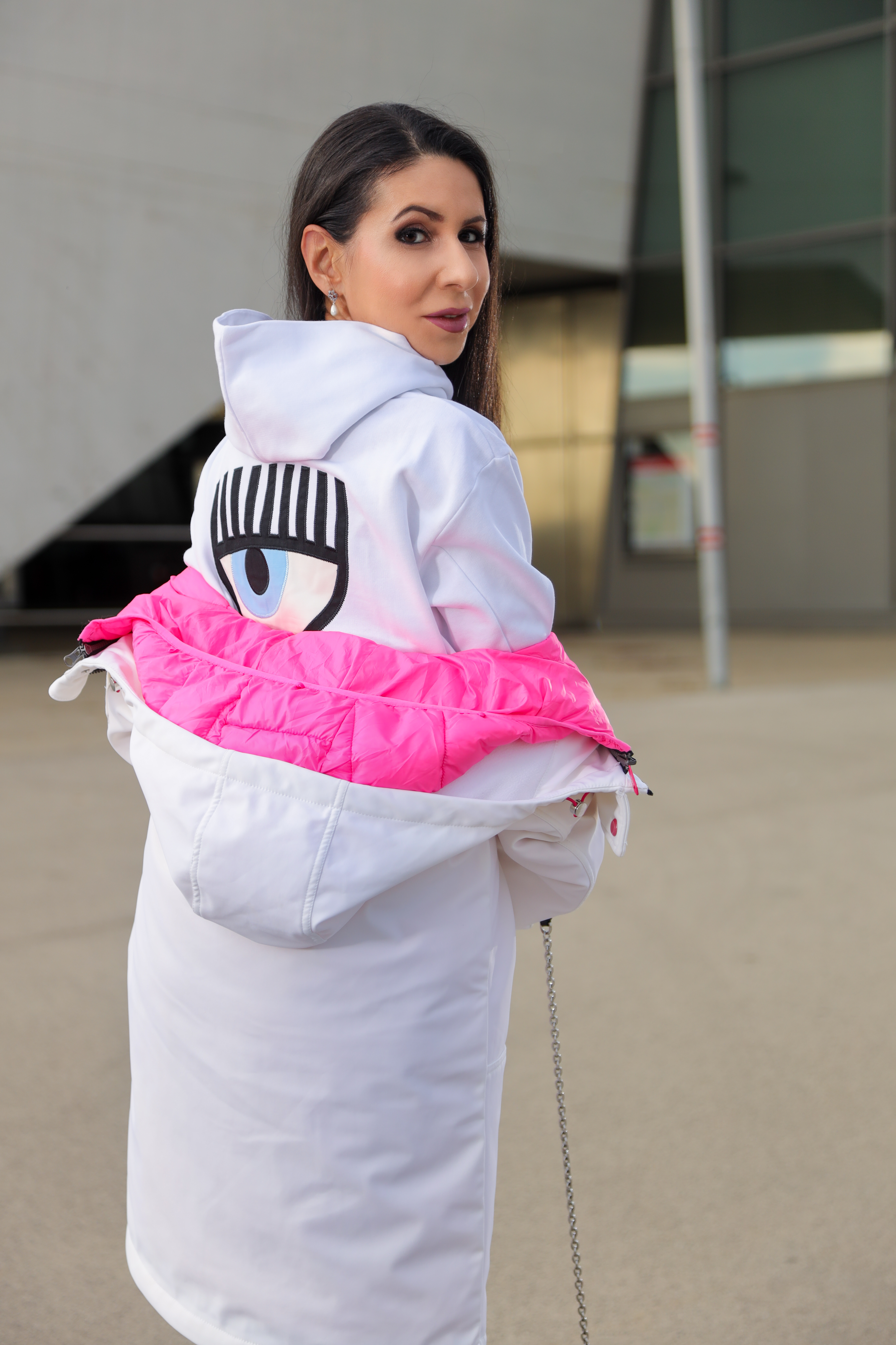 Obviously in this outfit of mine the main color is white with a pop of pink and black. It consists of my great 2-piece winter jacket – white and pink, THE NORTH FACE pink beanie, a great Chiara Ferragni white logo hoodie, a black sweet little Kenzo bag, a fake leather Calzedonia pants, a pair of nice matching Love Moschino sneakers, black & white LOVE MONKI socks and cool fingerless black OVS gloves – everything matched in a fashionway.