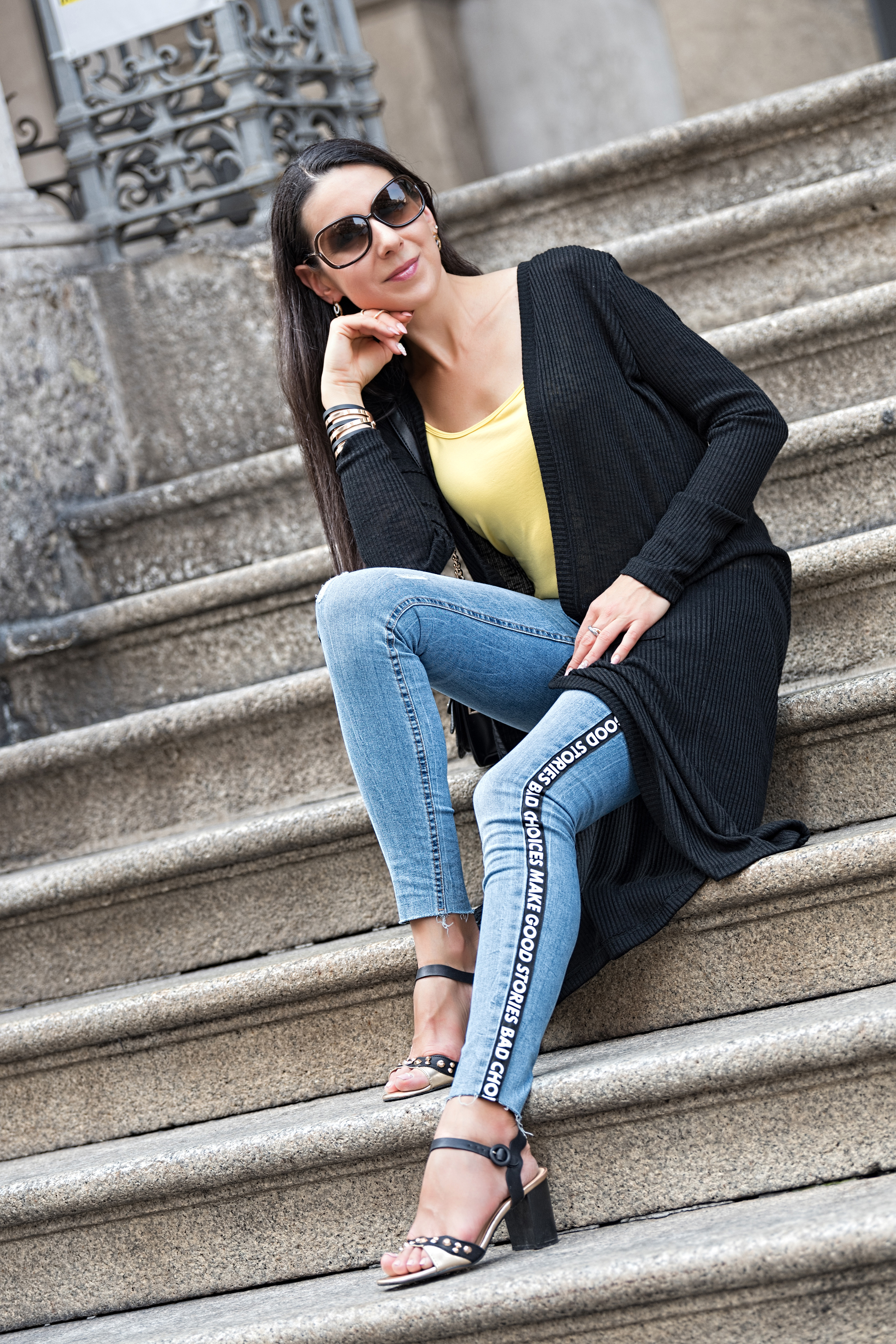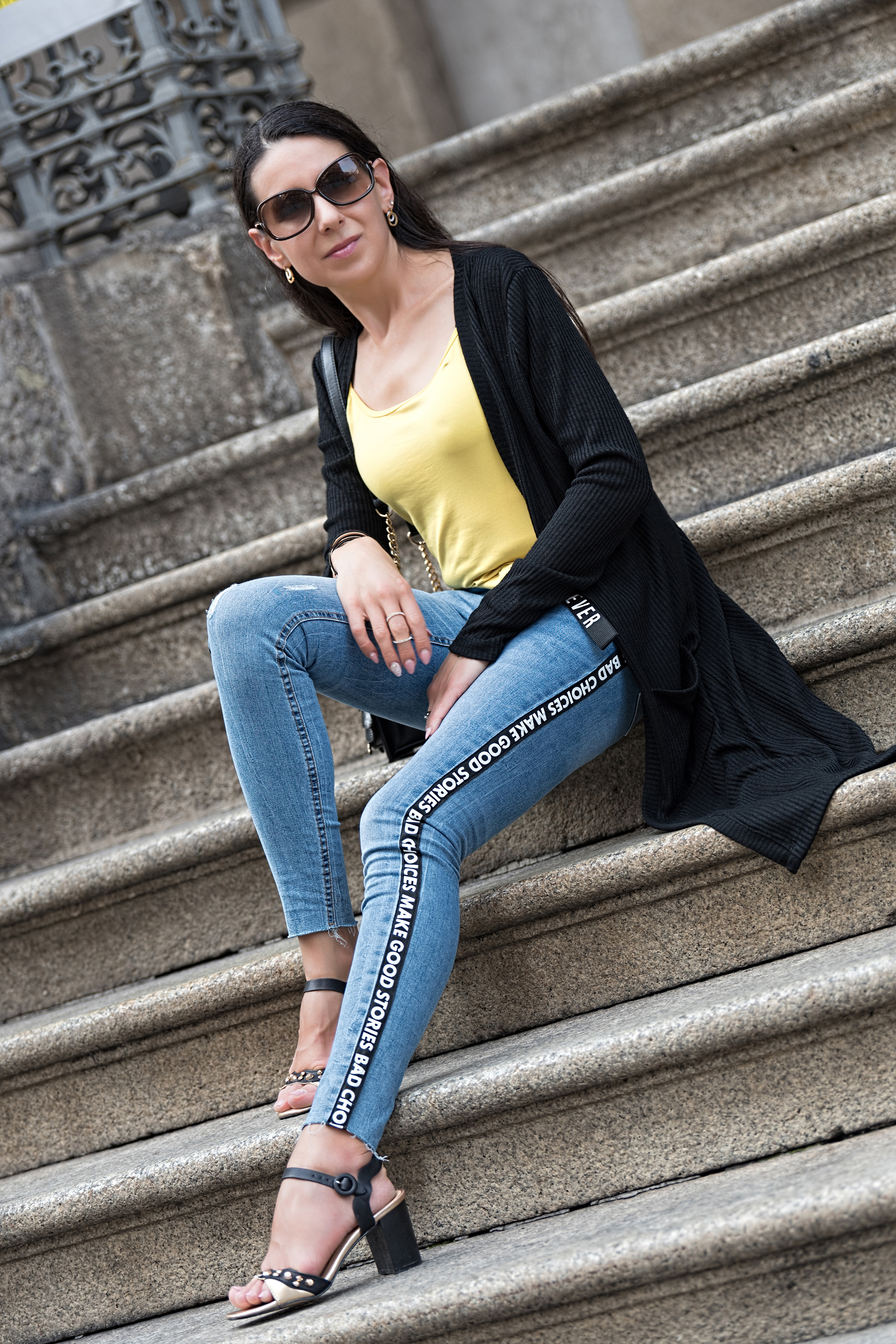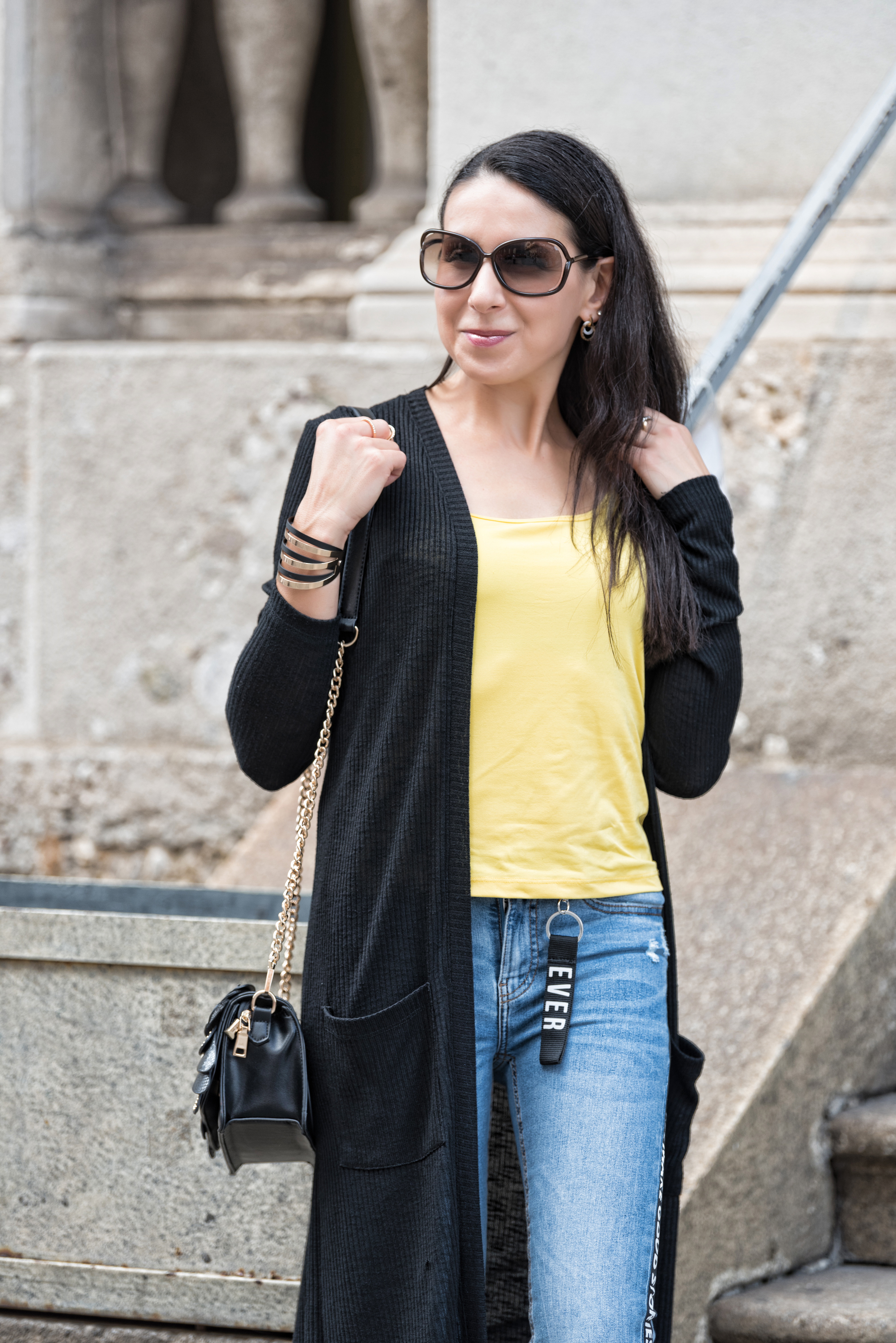 Some of the most fashionable colors for spring/summer 2019 are yellow, all the shades of sun, white and milky, all the caramel nuances, pastel colors and the always trendy black. Of course also many possible combinations between them. But as the spring is already here, the sun shines almost every day and I am in a sunny mood and in one of my favorite cities – Milano, my choice is this sunny yellow color. It is a daily outfit – a yellow t-shirt with a black cardigan which I find great. Normally, bright colors like yellow make one’s figure look bigger, that’s why combining with a light black coat or a cardigan proper for the season fits perfectly and makes the silhouette look great. And because I am a great street style fan, jeans are often my favorite to make the outfit complete. Of course with beautiful small accessories, in a fashionway!